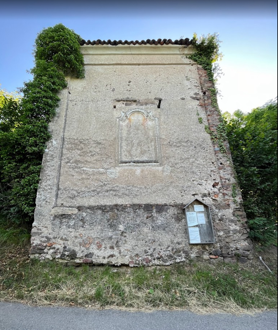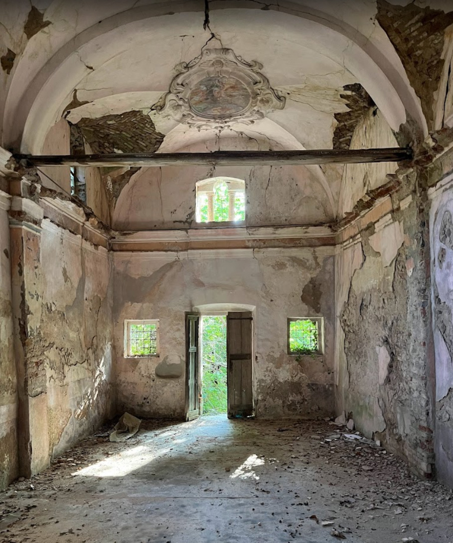 L’oratorio dedicato ai Santi Fabiano e Sebastiano si trova a poche centinaia di metri in direzione sud dal nucleo abitato di Colmo che – insieme ad altri piccoli agglomerati urbani – compone il Comune di Curino, classico esempio di centro insediativo sparso – attualmente su una superficie di 2.137 ettari – già presente con le medesime caratteristiche in epoca medievale. I primi documenti che citano il territorio di Curino come castrum loci Quirini o curtem Quirini sono del 1243, quando il Comune di Vercelli prese possesso della giurisdizione del luogo al posto del vescovo. Risalgono invece al 1387 le notizie relative al Cantone di Santa Maria, sede della parrocchia più antica (già esistente nell’XI secolo), cui risultavano essersi affiancate nel corso del tempo altre tre chiese: quelle di San Martino, di San Nicolao e di San Bononio, quest’ultima ubicata nella porzione settentrionale del comprensorio di Quirino, territorio scosceso e tormentato, servito anticamente da monaci benedettini inviati periodicamente dall’abbazia di San Michele di Lucedio. L’oratorio dedicato ai Santi Fabiano e Sebastiano – probabilmente già esistente – compare però solo in alcuni documenti del XVII secolo, come uno degli edifici di culto afferenti alla parrocchia di San Bononio, diventata ufficialmente tale nel 1654. Non ci sono altre notizie relative all’oratorio fino al 1733, quando ne viene semplicemente confermata l’appartenenza territoriale. Allo stato attuale, l’edificio si presenta in gravi condizioni di degrado: tuttavia risulta ancora leggibile la sua probabile origine trecentesca o quattrocentesca, soprattutto grazie al linguaggio architettonico che caratterizza i prospetti esterni. La facciata a capanna – scandita da fascia marcapiano e delimitata da paraste angolari – presenta superficie muraria parzialmente intonacata sulla quale si aprono un semplice portoncino d’ingresso affiancato da due piccole finestre, una nicchia quadrangolare e una trifora con fornice centrale archivoltato. A suggerire i probabili rifacimenti seicenteschi e/o settecenteschi c’è invece la nicchia modanata posta al centro del prospetto posteriore che anticipa esternamente la cifra stilistica degli interni dove si evidenziano alcune decorazioni pittoriche con cornici a stucco e due dipinti – probabilmente settecenteschi – che rappresentano i Santi Fabiano e Sebastiano.