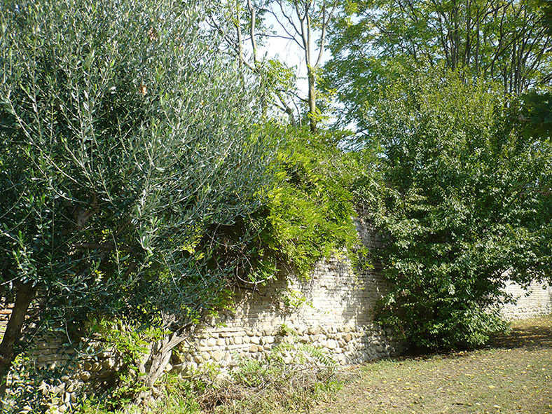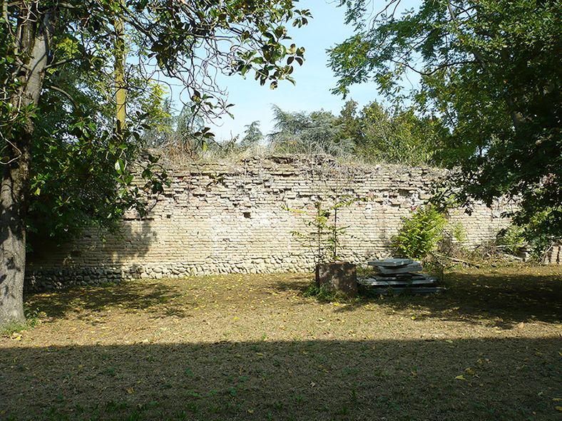 I resti delle mura storiche appartengono alla cinta muraria difensiva della Rocca di San Cesario sul Panaro, realizzata probabilmente nella seconda metà del secolo XIV, ad opera della famiglia Boschetti. La Rocca, secondo gli storici, oltre il muro di cinta era circondata da ampie e profonde fosse che potevano essere riempite d’acqua. Il tratto di mura storiche, che si affaccia oggi sul limitare del parco comunale, presenta la parte inferiore in sasso e quella superiore in muratura a sacco. La cinta muraria, che era interrotta da torri, fu quasi totalmente atterrata nell’Ottocento. I resti delle mura storiche di San Cesario sul Panaro costituiscono una testimonianza importante della storia del territorio e pertanto possiedono un rilevante interesse culturale. Tale riconoscimento appare opportuno per concorrere alla loro salvaguardia e conservazione. L’immobile in oggetto presenta anche requisiti di interesse archeologico, in particolare per quanto concerne il manufatto conservato nel sottosuolo e per le strutture ad esso correlate (fossato, contrafforti, ecc.). L’area in argomento è inoltre sottoposta, nei piani territoriali del Comune di San Cesario sul Panaro, a vicolo di scavo archeologico, con la prescrizione di sottoporre a parere autorizzativo ogni progetto che comporti modifiche dell’assetto attuale del sottosuolo.